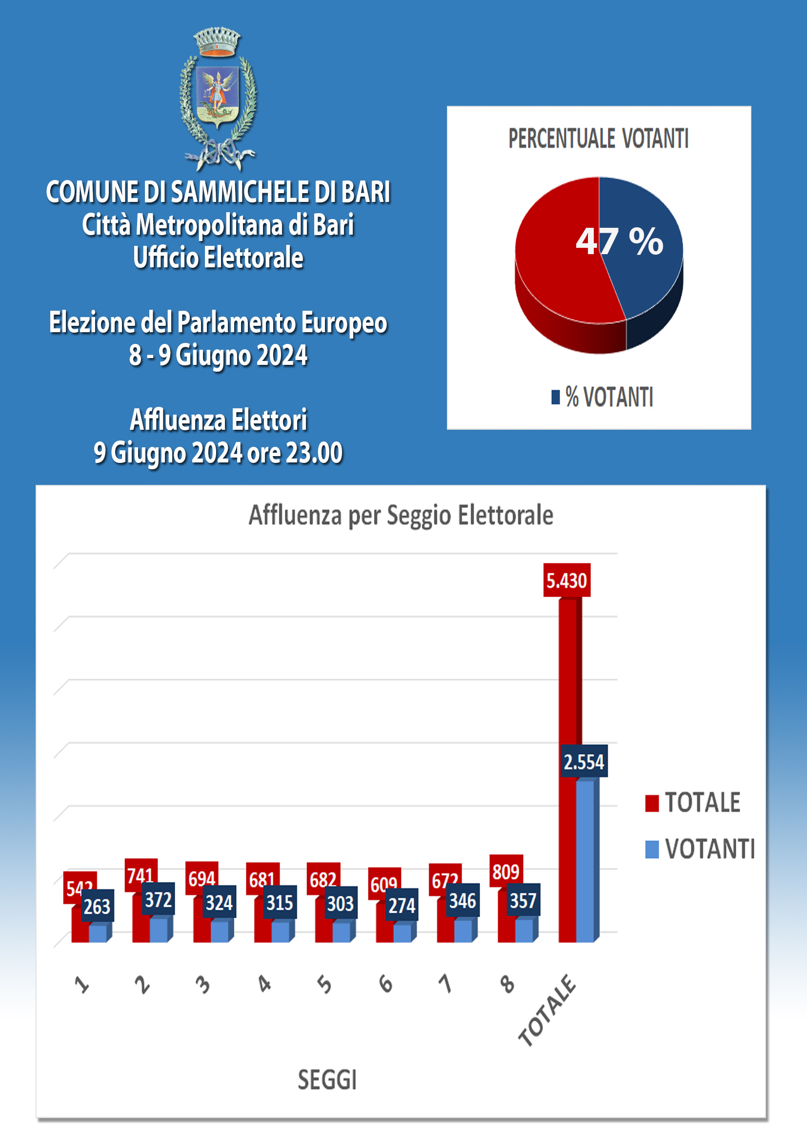 Elezioni Europee 8 – 9 Giugno 2024 – Affluenza Votanti 9 Giugno ore 23.00